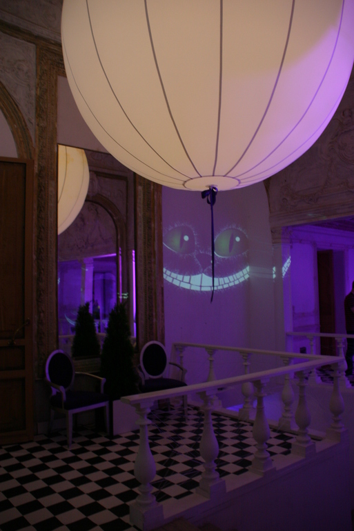 Выходим - над лестницей парит фонарик, а рядом периодически возникает изображение чеширского кота из проектора.