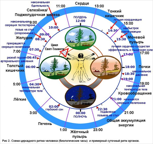 Легкие активизируются с 3 до 5 утра. Потом, с 5 до 7 утра - время пробуждения толстого кишечника. Если вы проснулись в эти часы, то лучше всего выпить 2-3 стакана воды. Потом начинает работать желудок с 7 до 9 часов утра, в это время лучше всего позавтракать. Чуть позже с 9 до 11 часов утра желудок отдыхает, в то время, как поджелудочная железа активно работает. Перегружать желудок плотным завтраком в это время не стоит, лучше всего перекусить фруктом или обезжиренным йогуртом. Обычное время ланча с 11 до 13 часов. В это время активно работает сердце - значит переедать не стоит. В эти часы лучше ограничить себя одним блюдом. С 13 до 15 часов активно работает толстый кишечник. Почки и мочевой пузырь начинают свою интенсивную работу с 15 до 19 часов. В это время надо много пить! И в этот промежуток должен быть ужин. С 19 до 21 часа почки начинают отдыхать, поэтому в это время пить надо поменьше и постараться не есть. А вот кровообращение в это время интенсивное! Это самое хорошее время для вечерней прогулки. С 21 до 23 часов лучшее время для того, чтобы отправиться спать. С 23 до 01 часа ночи начинает свою работу желчный пузырь. С 1 ночи до 3 ночи работает печень. В рациональном питании важны регулярный прием пищи в одно и то же время суток, дробность приема пищи, распределение ее между завтраком, обедом, ужином, вторым завтраком, полдником. БИОЛОГИЧЕСКИЕ ЧАСЫ ОРГАНИЗМА Если научиться подстраиваться под расписание биологических часов своего организма, можно регулировать не только свое поведение, но и настроение. Многочисленные исследования доказали, что все мы живем по определенным биологическим часам. И хотя у разных людей эти часы могут немного спешить или отставать, тем не менее, средние значения окажутся справедливыми для большинства людей на планете. Итак, какие наши органы в какое время суток отдыхают или наоборот, становятся гиперактивными? Час слепоты - острота зрения у человека сильнее всего снижается в 2 часа ночи, что особенно важно знать автомобилистам. Час рождения и смерти - большинство детей рождаются на свет между 0 и 4 часами ночи. В предутренние часы (около 4) чаще всего случаются инфаркты и инсульты у людей, страдающих сердечно-сосудистыми заболеваниями. Час вялости - самое низкое артериальное давление наблюдается между 4 и 5 часами утра. Час любви - наибольшая секреция половых гормонов наблюдается с 8 до 9 часов утра. Час обезболивания - с 9 до 10 часов утра у человека самая низкая болевая чувствительность. Час творчества - полушарие головного мозга, отвечающее за творческие и абстрактные образы, наиболее активно работает с 10 до 12 часов дня. Час физкультуры - наибольшую отдачу наши мышцы демонстрируют с 12 до 13:30. Час пищеварения - больше всего желудочного сока образуется с 12:30 до 13:30. Час мастерства - с 15 до 16 часов лучше всего работают пальцы рук, что немаловажно для тех, чья деятельность связана с мелкой моторикой и тактильными ощущениями. Час роста - волосы и ногти быстрее всего растут между 16:30 и 17:30. Час бега - наиболее интенсивно легкие дышат между 16:30 и 18.00 Час органов чувств - вкусовые ощущения, слух и обоняние обостряются между 17 и 19 часами. Час алкоголя - наиболее эффективно печень расщепляет алкоголь между 18 и 20 часами. Час красоты - кожа наиболее проницаема для косметических средств между 18 и 20 часами. Час общения - тяжелее всего одиночество переноси