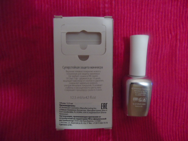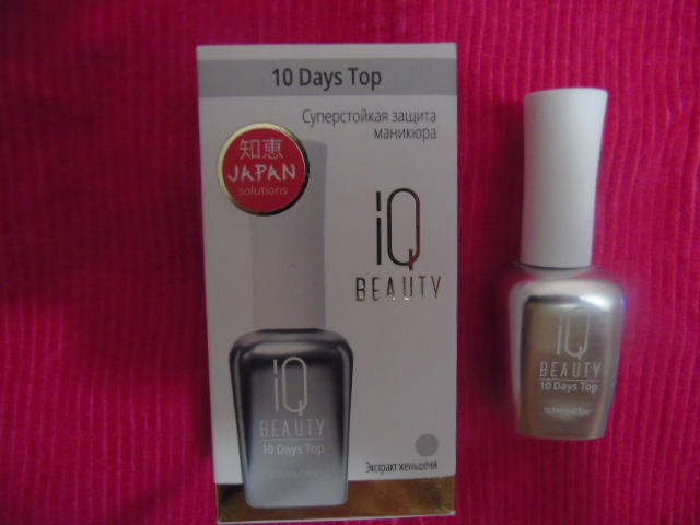 Прочитала отзывы других участников сообщества и тоже захотелось рассказать об одном средстве, которое, думаю будет интересно не только хозяюшкам и мамочкам в декрете, но и абсолютно всем, кто любит красивый маникюр. Это средство для ногтей фирмы IQ Beauty Суперстойкая защита маникюра/ 10 Days Top.