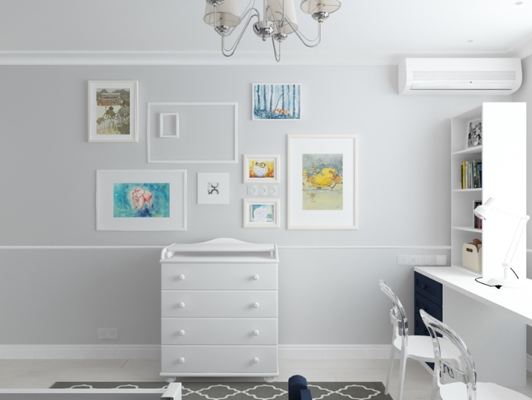 Т.к. гардеробная будет в отдельном помещении, шкафы для одежды не размещали. По плану перепланировки будет встроенный шкаф для игрушек. Рабочий стол и стеллаж будут на заказ. Кровать для старшего сына длиной 1,6м. В будущем можно будет купить такую же кровать и разместить рядом.