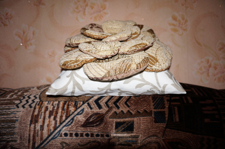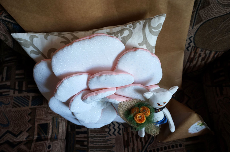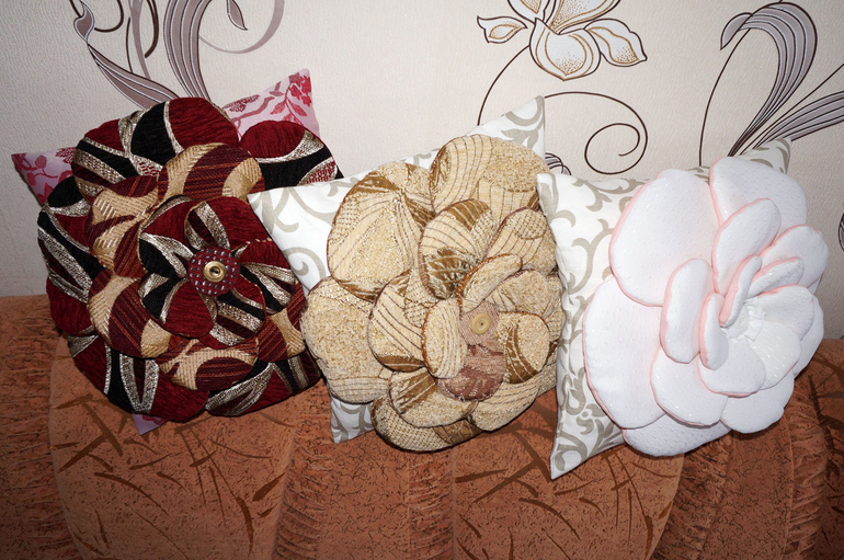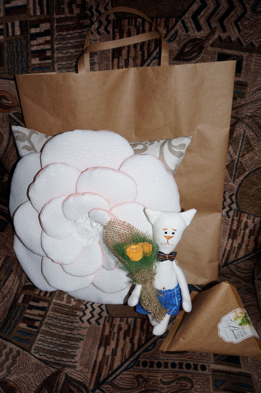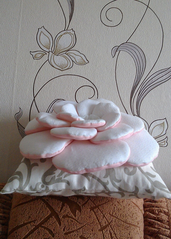 На 8 марта захотелось поучаствовать в рукодельном обмене. Цвет мне достался белый. С ним у меня ассоциировались цветы, так пошилась подушка-цветок, очень она мне понравилась и пошилось еще пару подушек на подарки ))