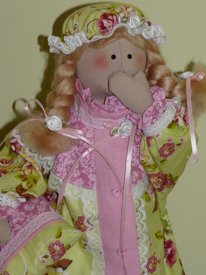 Благодаря тому, что мастер учла все наши пожелания, куколка изумительно подходит по цвету в спальню. Приехала она не одна, а с маленьким другом - медвежонком. Полинка его весь вечер, везде носила с собой.