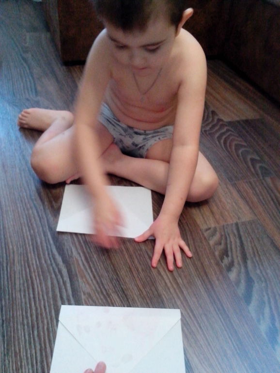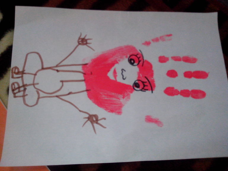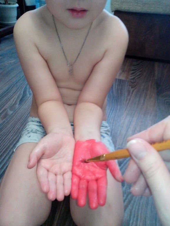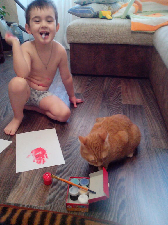 Первым взялись за задания с ладошками. Фото процесса и результата. Постелили плед для Ксюшки, чтобы она нас видела и уселись на пол. Достали краски и фломастеры и начали( ну и как же без кота! )