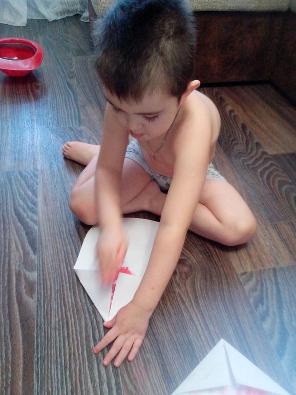 , а мы приступили к саиолетикам. Эта забава уже известна и любима моими мужиками. Они частенько устраивают авиагонки. А сегодня я решила, что пора Илюхе учиться самому делать этот транспорт. Я показываю, он повторяет.
