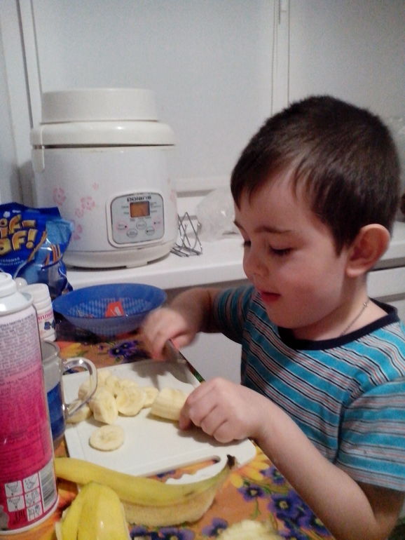 Готовит себе вкусняшку- банан со взбитыми сливками