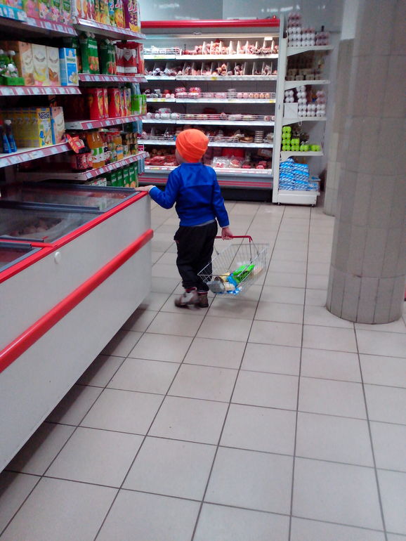 Сам носит корзину, открывает и держит двери, если идем с коляской.