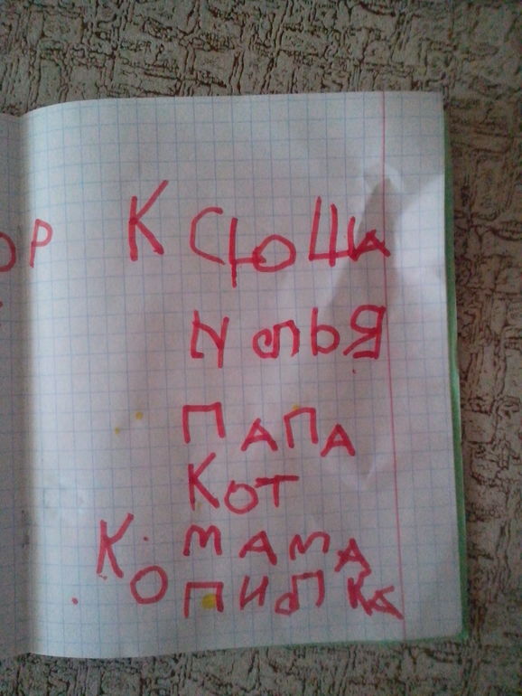 Радует, что четко слышит какой звук надо писать, правда иногда напоминаю, какую букву надо писать. Результат на фото