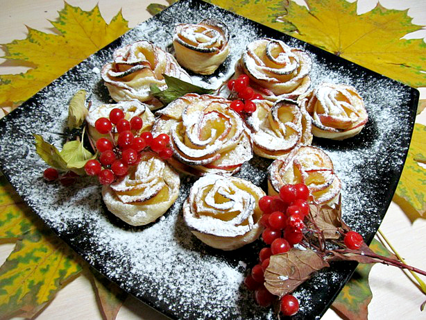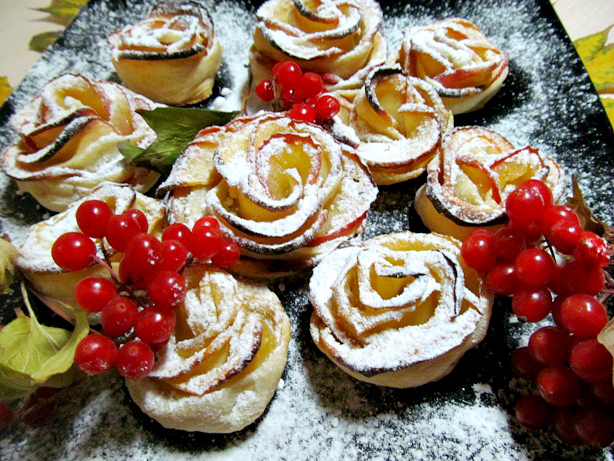 И да, немного розочки у меня загорели...а почему? а потому, что я - вообще никогда ничего не пекла со слоенным тестом, и не могла понять готово или нет! Цвет его как то особо не менялся, во - вторых я вообще очень мало пеку сладкого )не считая шарлотки..у меня даже духовка без градусника, его заменяют цифры, но я забыть забыла, какие цифры соответствуют какому градусу, о как! Кулинар еще тот)) Поэтому и вышел небольшой загар, который вкус не испортил, а даже придал изюму, нет не горелого!)))