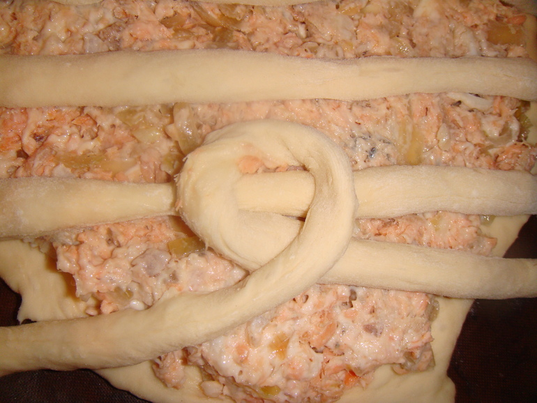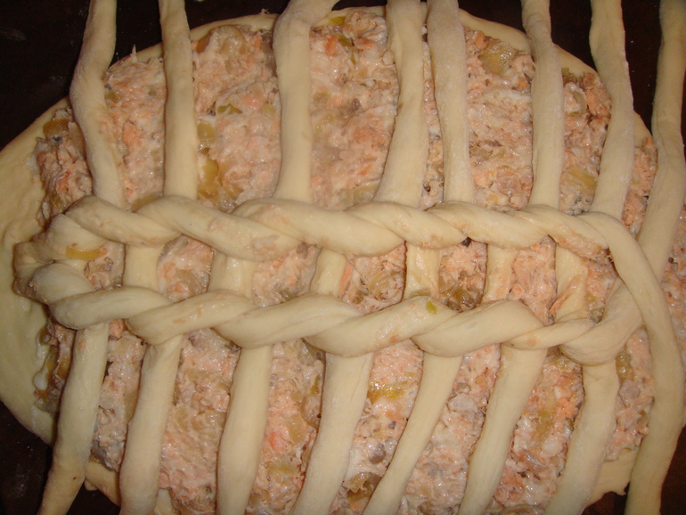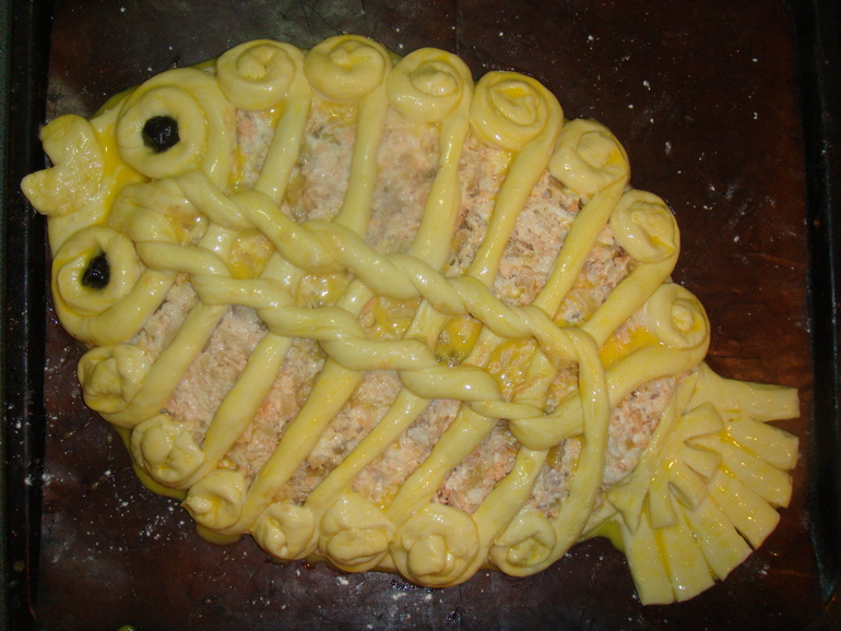 Оформить голову и хвост. Смазать разбитым яйцом.