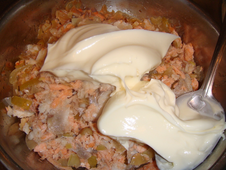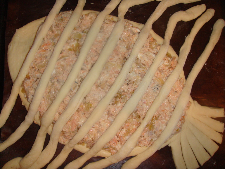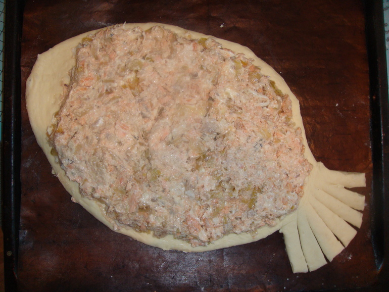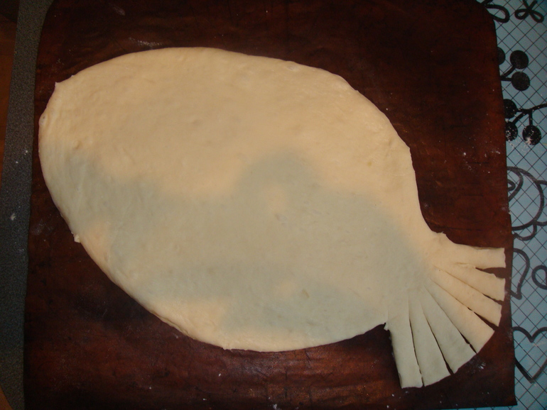 Готовое тесто разделить на 3 части. 2/3 раскатать и вырезать силуэт рыбы (сразу на противне):