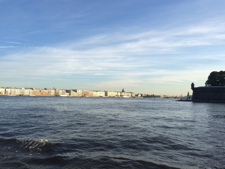 Нева огромная, просторная, такая обширная, вид с нее на Дворцовую набережную просто потрясающий!