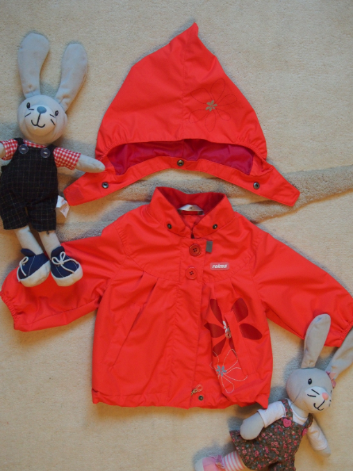 не промокаемый полукомбинезон мышиного цвета (бретели на липучках, регулируются) и курточка ярко оранжевого цвета интересного девичьего кроя (подрезная кокетка, как на полочке, так и на спинке, и под ней складочки для пышности), с красивыми аппликациями в виде цветов, некоторые из которых являются сами по себе светоотражателями. На курточке по нижнему краю есть резинка, камашки, закрывающиеся на молнию. Рукава тоже заканчиваются резиночками. Капюшон отстегивающийся, конусовидного кроя, под помпон на шапочке, застегивается под подбородком на липучку, чтобы не задувал ветер.