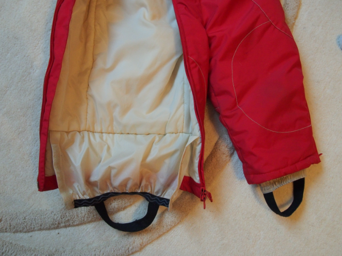 Ткань с пропиткой, непромокаемый и непродуваемый, не пачкается. Для удобства одевания полностью на молнии. Очень теплый и практичный комбинезон. Наполнитель-холофайбер. Капюшон снабжен козырьком и защитой до подбородка. По талии есть резинка, которая обеспечивет более плотное прилегание.