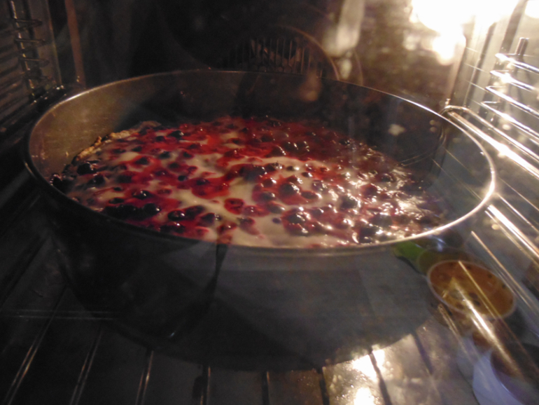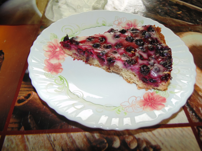Сахар по вкусу, у меня примерно 70г. Сметана 200г. Размешать. Добавить пару ложек муки. Снова размешать. Всыпать крепкие ягоды. Много ягод черной смородины)). Аккуратно размешать, чтобы не помять ягодки. Вылить на тесто.