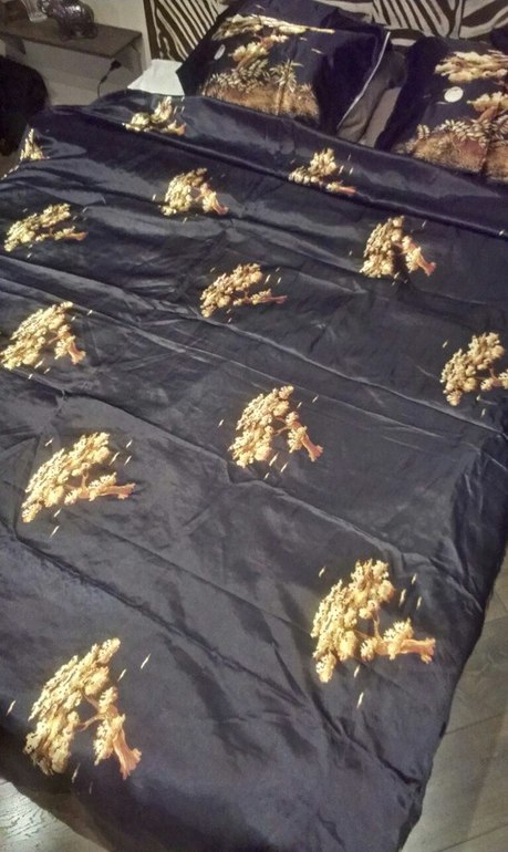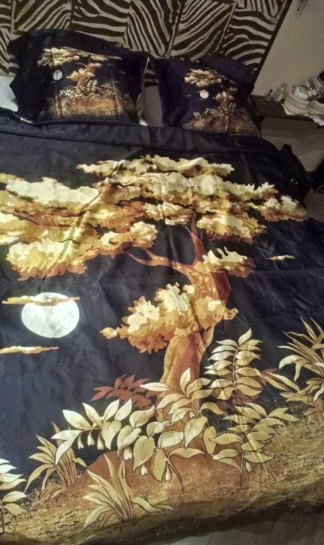 ОбменКомплект постельного белья новый (б\у только на примерку, мужу не понравилось, поэтому не стали пользоваться, но есть недочет - след-полоска на одной из 4х наволочек, от утюга примерно 1,5 см, но особо незаметно (видимо свекровь решила перестирать и погладить, а у нее проблемы с глажкой). Комплект стирался, внешний вид не потерял, не деформируется, вообще глажки не требует, приятный на ощупь, но для любителей шелка. Состоит из пододеяльника, простыни и 4 наволочек (классич. и евро размер). Все на молнии. Без родной упаковки!!! Экв.2000
