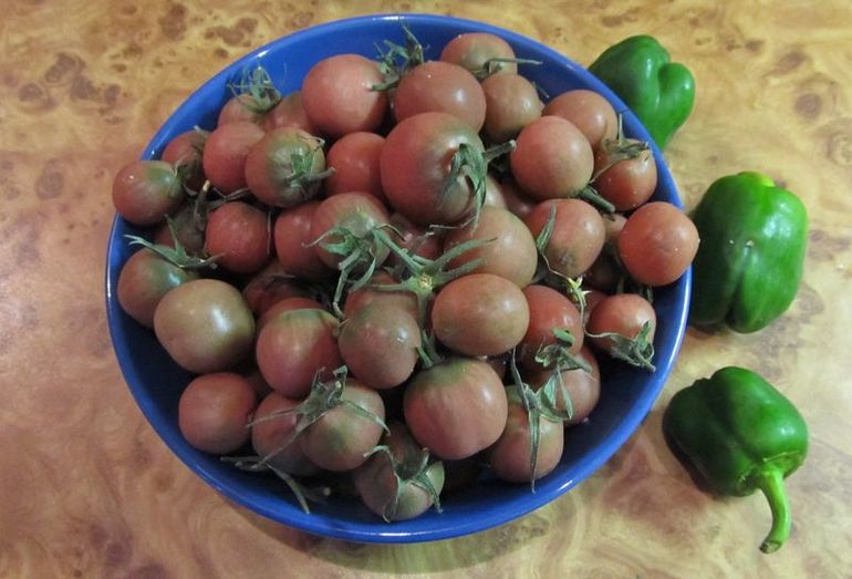 Черри в этом году у меня тоже необычные. Все, наверное, пробовали или хотя бы просто видели в продаже импортные розово-синеватые помидоры с темно-зелеными разводами около плодоножек? Обычно они круглые или овальные, средних размеров. Так вот, а у меня в открытом грунте выросли в этом году черри такого цвета. Вкуснющие, просто прелесть! :) К сожалению, света даже со вспышкой не хватило для нормальной цветопередачи, реально помидорчики более розово-синеватые, и даже сок у них розово-фиолетовый.