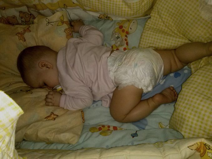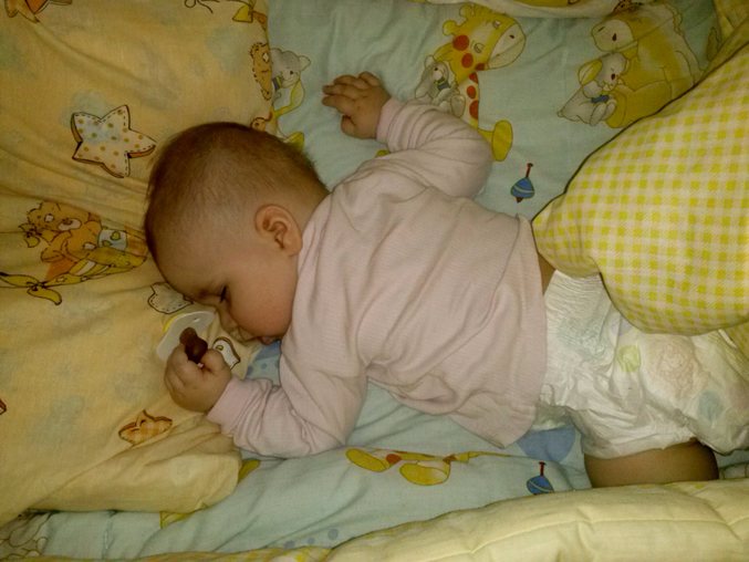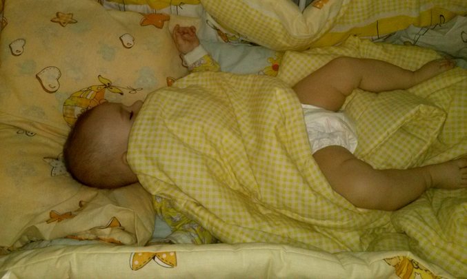До этого он всегда спал только со мной или в коляске, при чем приходилочь укачивать по 40 минут с криками и слезами и бывало сутками мы не спали (ну кто читает мой днев помнит нашу эпопею со сном). вчера решилпа попробовать положить в кровать днем, положила и пошла бцтылку мыть, думаю приду покачаю, слышаолав как он кряхтел, а потом тишина, захожу в комнату ,а там (это было в 14.00):