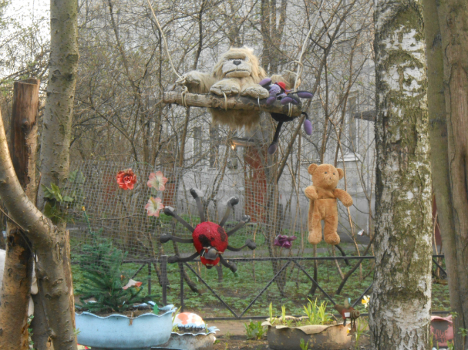 у тебя фото есть,где игрушки на площадке мягкие, на деревьях висят. что это? это детская площадка такая ?