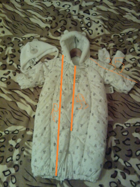 К нему в подарок шапочка и варежи(покупали отдельно).Размер по маркировке 6-9 мес.