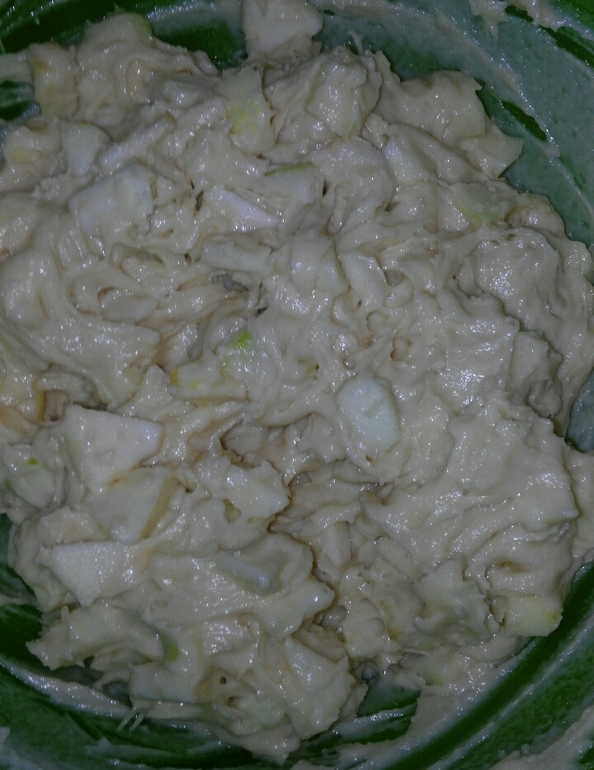 Всыпаем нарезанные яблоки в тесто и перемешиваем.
