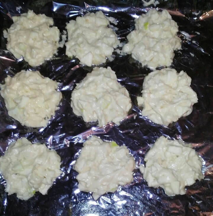 На противень, смазанный растительным маслом столовой ложкой выкладываем тесто, формируя отдельные яблочные печенюшки.