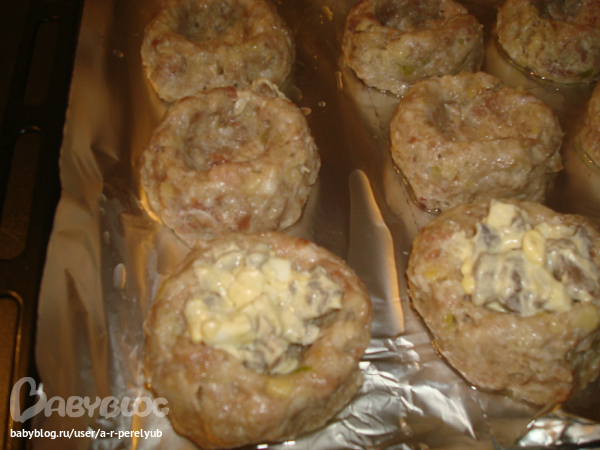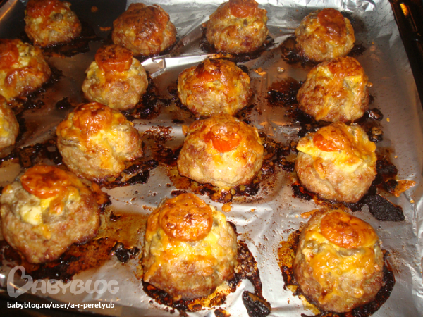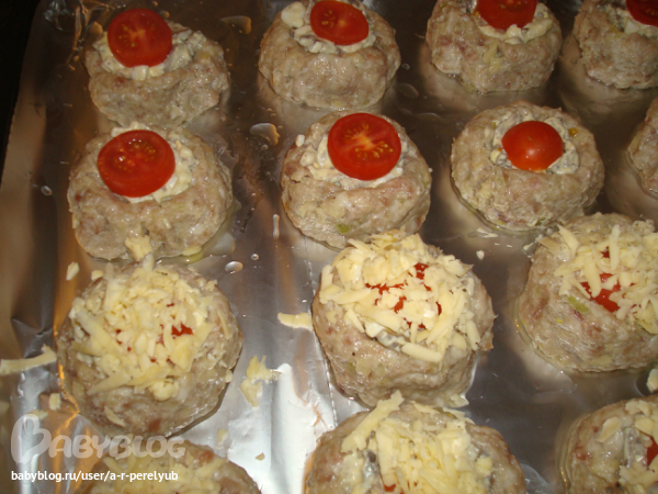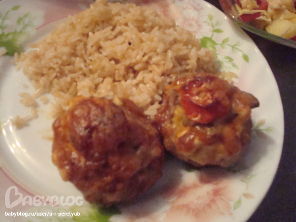 Из фарша формируем шарики, чуть больше куриного яйца, выкладывает на пртивень и делаем пальцами углубление, выкладываем начинку, сверху дольку помидорки чери и посыпаем сыром тертым. В разогретую до 180 гр. духовку на 40 минут. Получается очень вкусно! Рекомендую на ужин, а на гарнир делала рис. Берем шлифованный, пропаренный рис, 3-4 ст.л. растительного масла. В казан выливаем масло нагреваем хорошо, высыпаем 1 стакан риса и на огне чуть больше среднего обжариваем до золотистого цвета, добовляем специи (у меня смесь перцев) соль, перемешиваем, 2 стакана воды, доводим до кипения, без крышки даем выкипеть большей части воды, потом огонь убовляем до самого маленького, закрываем крышкой и 20 минут до готовности. Рис рассыпчатый получается. А салат был "Коко Шанель", постараюсь сейчас выложить его.