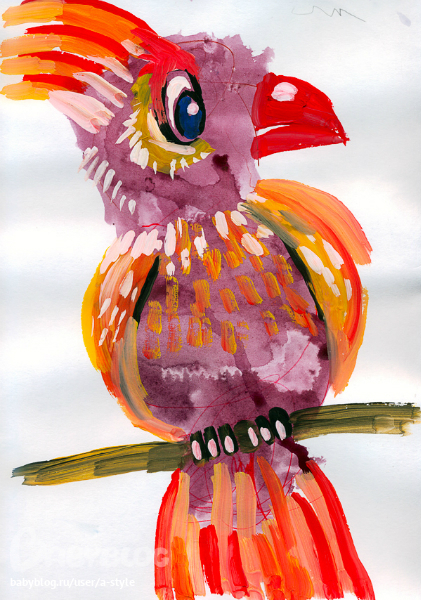 Попугай - наше совместное творчество. Было ужасное бордовое пятно непонятной формы, стало понятной))))