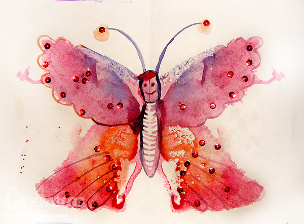 Еще мы делали бабочек в технике монотипия. Т.к. отпечаток в любом случае надо дополнять деталями, то мы его не только дорисовали, но еще и приклеили блесток.
