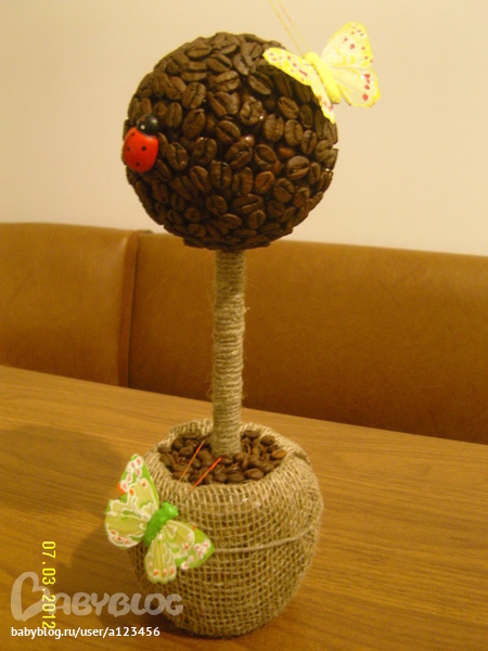 Девочки, здравствуйте! Хочу показать своё кофейное деревце, делала его в подарок на 8 марта своей начальнице. Она очень хороший человек и мне хотелось сделать ей приятное! Это моё четвертое деревце, самое первое делала для себя, а ещё два деревца подарила сестре и подруге. В связи с тем, что сейчас постоянно с сынишкой и на походы по магазинам нет времени, то приходится дарить подарки сделанные своими руками)))
