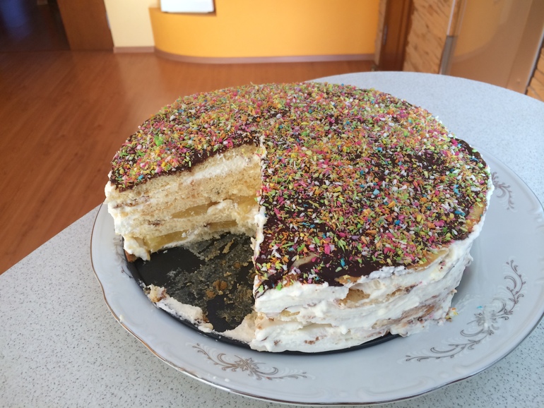 дальше делала так взяла форму разьемную и выкладывала туда в такой последовательности: корж, смазала сиропом из под ананасов, потом крем и кусочки ананасов и так до последнего коржа, на последний сверху сделала шоколадную глазурь и посыпала присыпкой.