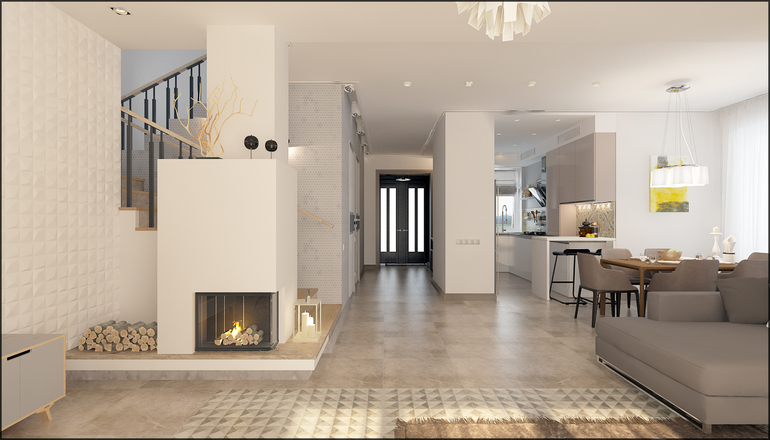 Задача дизайнера была сделать бюджетный интерьер. Белые стены. Использовать три д панели (моя любовь).