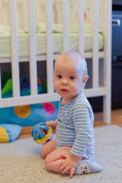 Ну и садиться научился из положения на четвереньках. Пока не часто это делает. Теперь когда он еще лучше научился передвигаться, с ним стало еще проще.