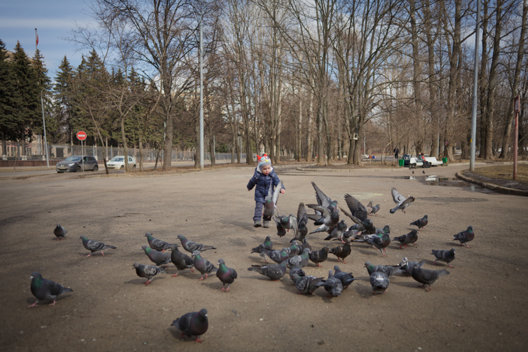 А голуби. Вы давно гонялись за голубями? Эти смешные птицы, нелепо качая головой, ходили туда-сюда по тротуарам, тут и там поклевывая что-то съедобное с земли. И тут вдруг появляется он... и вот уже кучка птиц разбегается кто-куда, чуть взлетая, вновь садясь на землю, чтоб перевести дух.