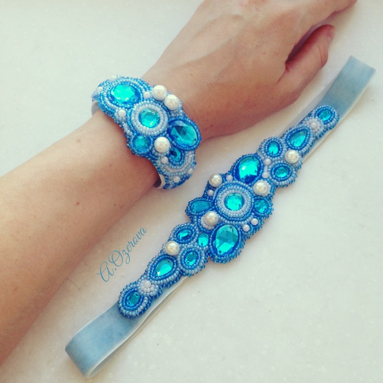 Повязка на голову и браслет: чешский бисер, жемчуг, бусины, стразы, фетр и эластичная бархатная лента.