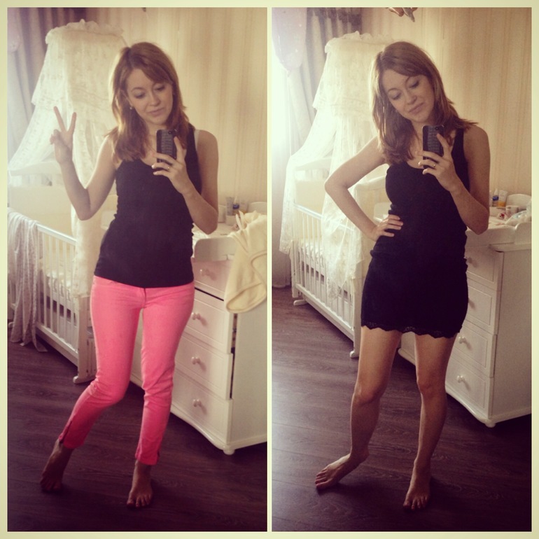 Это я на шестой день после родов, примеряю свой гардероб. П.с. с легкостью "влезла" во все добеременные одежки