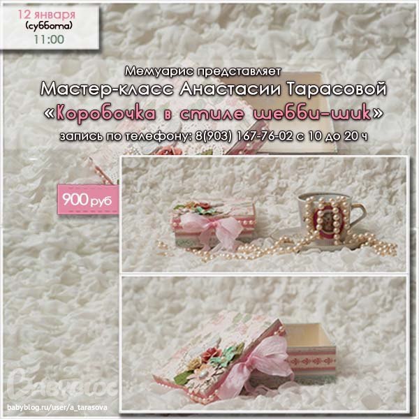 Девочки, приглашаю вас на Мастер-Класс по созданию коробочки в стиле шебби-шик,который состоиться 12 января (суббота) в 11 часов в студии магазина мемуарис. Записаться можно уже сейчас,группу набираем традиционно до 10 человек. Все материалы входят в стоимость и с собой вы унесете замечательную коробочку,которая послужит вам в качестве шкатулочки для украшений или подарка к любому празнику,начиная от свадьбы и заканчивая рождением или крещением малыша.