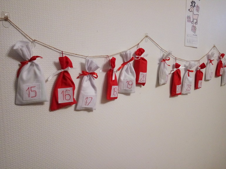 В этом году экспромтом решила сделать мини-адвент для Димы. Делала все "на глаз". Вчера повесили на стену, Дима помогал. Я думала, он сразу захочет открыть мешочки, но как-то спокойно отнесся к ним, хотя и знал, что в каждом мешочке его ждет сюрприз - или вкусняшка или игрушка + задание.