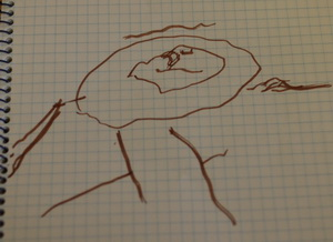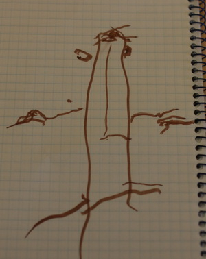 Этот вообще очаровашка, но по 5 пальцев с каждой стороны почему-то сразу из туловища растут:)) Кстати левые и правые руки и ноги у "пугала" она тоже рисует разными руками