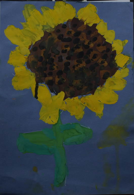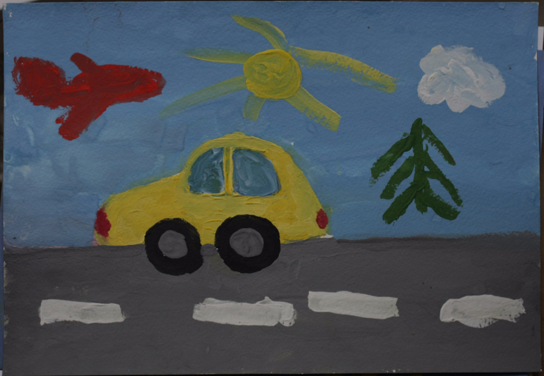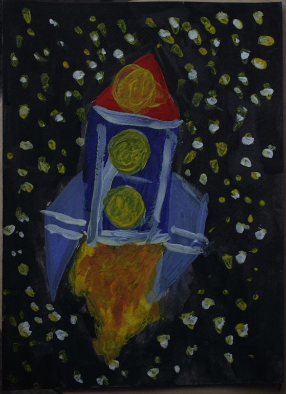 Я смешиваю краски - это у нее пока не получается, но она уже сама набирает с палитры, скетч она сама рисует, там где начинает потом рисовать без скетча и без образца в виде урока получается пока плохо (на картинке с машинкой без скетча нарисованы елка, облако, солнце, самолет). Прямо к рисованию я приложила руку в двух местах - выровняла контур у машинки - это видно, по сравнению с др. рисунками, после чего она мне заявила, что я испортила ее рисунок:)) сейчас смотрю на остальные работы и пожалуй с ней соглашусь. вот в подсолнухе я не притрагивалась, контуры не ровные, но он очень классный:) не надо было и машинку трогать:) и в пейзаже у нас не было фиолетовой краски для туч, мы намешали, но не удачно получилось почти коричневый, я эти тучи стерла влажной салфеткой (после чего она сказала, что и этот рисунок я испортила и отказалась дорисовывать:)). Ко всему остальному руку не прикладывала:) А не, у ракеты еще левое крыло, тоже ровняла:) а правое ее:) Ну и конечно словом я ей подсказываю - давай попробуй вот здесь потемнее/посветлее сделать и т.п. и краску соответствующую подсовываю.