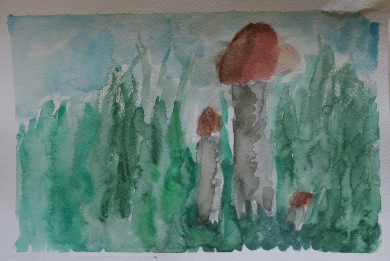 Так что даже по стандартному уроку ребенок рисует что-то свое где-то из-за того, что технически не может повторить, где-то потому что у него свое виденье, и форму грибов, и именно такую траву и небо - это она все сама придумала, я только язык прикусила, когда она начала тянуть траву на весь лист:)) а в итоге ничего так даже вышло:)) Может если бы я в предыдущих уроках меньше "командовала", они бы тоже сильнее отличались от оригинала:))