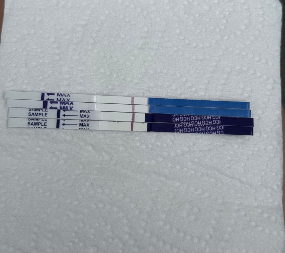 Два по середине вчерашние на одну мочу , верхний и самый последний сегодняшний, на разную мочу, очень конечно похож на реагент, на верхнем тоже как будто что-то есть, камера не ловит