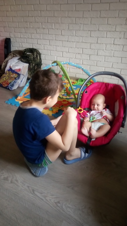 Очень любит брата, выделяет его, сразу улыбаться начинает. Аким его веселит, устраивает целые представления. Целует его, просит подержать на ручках.