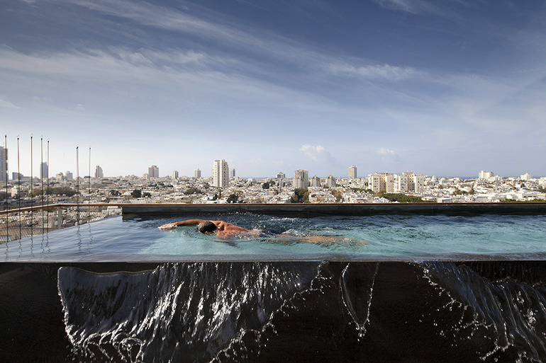 Студия Pitsou Kedem Architects представила современный пентхаус в новом здании, но в старой части города Тель-Авива, Израиль. Этот проект демонстрирует полное слияние внутреннего пространства с безграничным внешним миром благодаря раздвижным стеклянным дверям со всех четырёх сторон резиденции, общая площадь которой составляет около 600 кв. метров. Пентхаус занимает весь верхний этаж дома и оформлен в современном стиле с явным интернациональным акцентом. Тем не менее в декоре ощутимы нотки влияния классики. В качестве основных отделочных материалов следует отметить бетон, метал, стекло и камень. Все очень натуральное и очень грубое. На террасе посажены красивые деревья, которые повторяют городскую картинку, а тёмное дно в бассейне позволяет ей лучшим образом отражаться в воде. Ну а коллекция картин, принадлежащая хозяевам резиденции, выступает финальным акцентом в проекте.