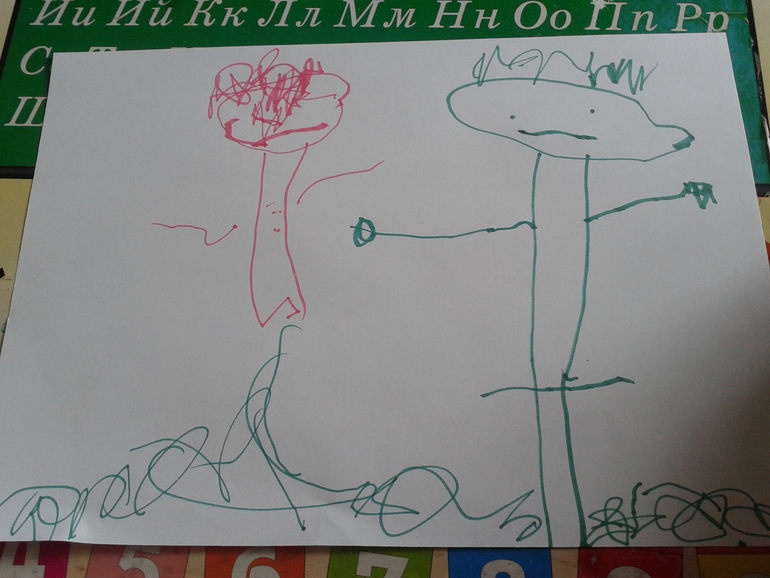 Сегодня обнаружила вот такой рисунок. Ксенька (2г.10 мес.) его сама нарисовала, рядом никого не было. Я с ней совсем не рисую. Ну не люблю я рисовать. Рисуют только с Мироном. А это вот ее произведение, собственноличное!