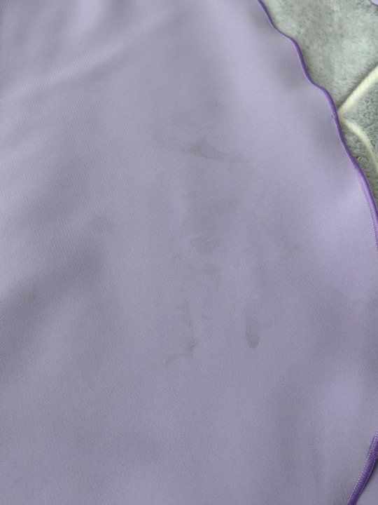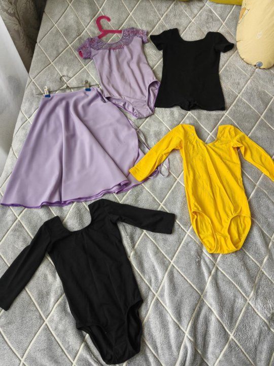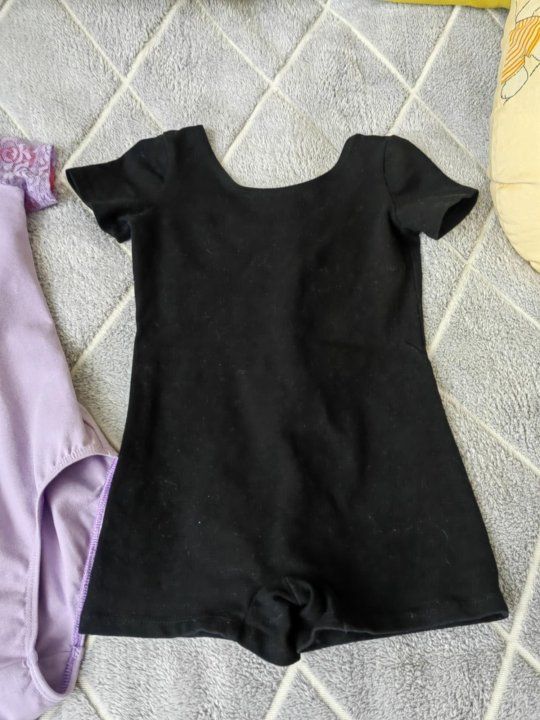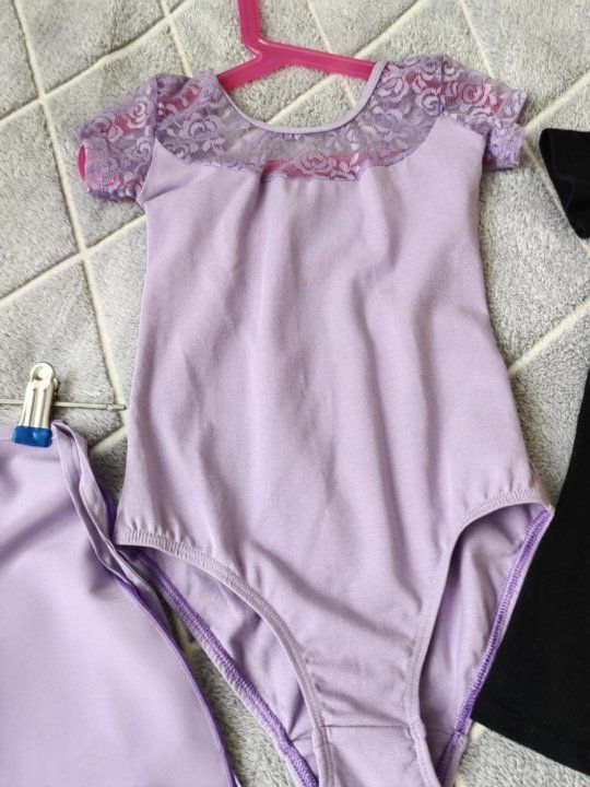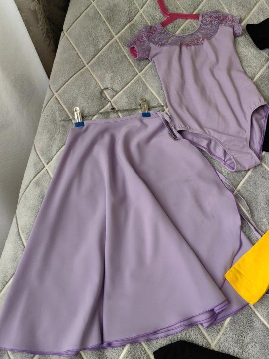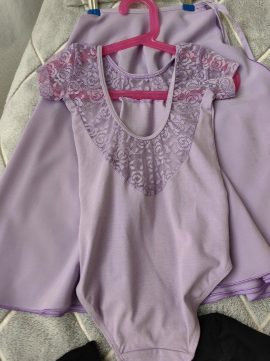 Сиреневый купальник и юбка были одеты по 1 разу на выступление. Юбка немного испачкана, надо постирать. На размер 134. Юбка длинная ниже колена.