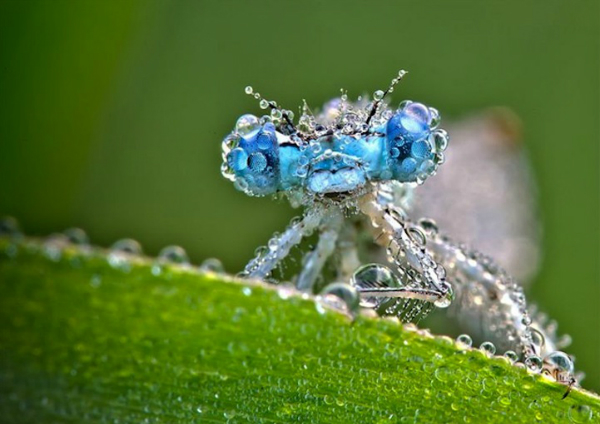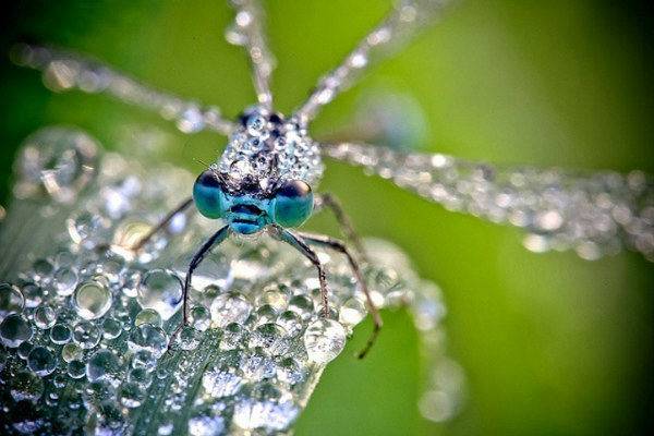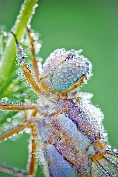 Захватывающие кадры не просто представляют крупным планом крохотные части тела стрекоз и других мелких насекомых, а изображают их украшенными хрустальными капельками утренней росы.