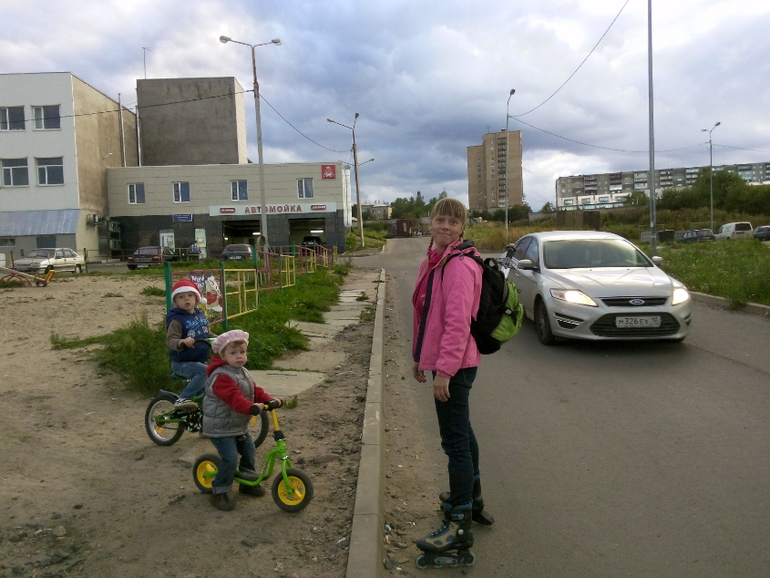 Вопрос, что я делала в сентябре на роликах? Мы теперь так ходим гулять. Саша на велосипеде (он научился на даче гонять по грунтовке, а тут, на асфальте, вообще летает, как ветер), Маша на беговеле, я на роликах.