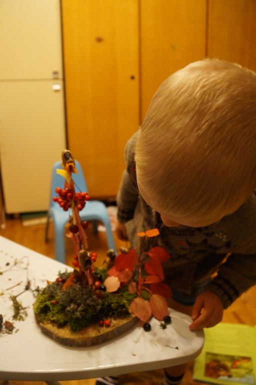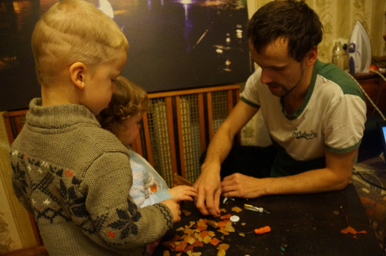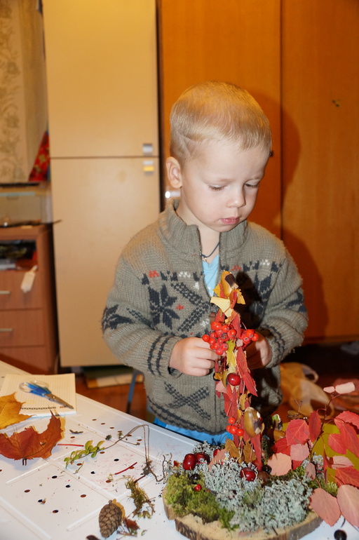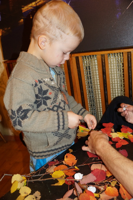 Листьев у нас была гора, всяких разных. Были шишки, желуди, ягодки, яблочки и т.д. Творчество разделилось: мы с Сашей делали совят, Маша старательно нам мешала, как могла))) Витя - как лучше всех рисующий - рисовал и вырезАл основание дерева.