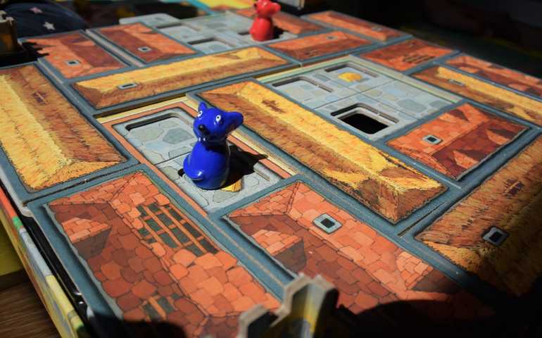 Пару минут на постройку замка (поле в несколько слоев, включая коробку), быстренько выбрали себе команду мышат и погнали по крышам собирать разнообразные виды сыра. Интересно играть как вдвоем, так и максимальным кол-вом игроков - 4. За свой ход игры можно сделать 4 шага по клеткам (открытие крыши в том числе). И вроде бы цель игры набрать 5 видов сыра кажется очень легкой. Но тут подстерегает опасность в виде двигающихся плит (можно провалиться в подвал и потерять мышонка) и опять же - внимательность. Если мышонок не стоит на определенном кусочке крыши, то она закрывается. Соперники передвигают плиты и поди ж ты, вспомни, где тот самый недостающий вид сыра.