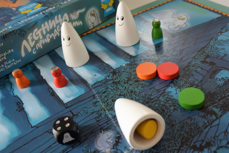 Аааа, коварнейшая игрушка:))). Все начинается очень невинно: в зависимости от того, как упадет кубик, топаешь по полю-лестнице. Радуешься, что обгоняешь соперников и тут бац, ты - привидение. Ладно, думаешь, дойду и в колпачке. Вот же она, моя фишка, слежу внимательно за своим привидением. А потом и другие облачаются в такие же колпачки, кубик предлагает пару привидений поменять местами на ступенях и ты начинаешь сомневаться, твоя ли фишка прячется под колпачком. А это ты узнаешь, только когда доберешься до конца лестницы. Вика старается незаметно подглядеть, мальчишки не разрешают, а ты приводишь чужую фишку к финалу и доказываешь, что так все было и задумано. Ага-ага, парни не верят, Вика (если проиграла) расстраивается жутко. А потом успокаивает тебя: "Мамочка, тебя тоже нельзя одну выпускать гулять, сразу потеряешься".